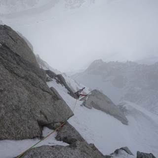 À une bifurcation, toutes les autres cordées s’embarquent dans une erreur d’itinéraire et nous nous retrouvons enfin seules avec Vérane, au milieu de cette sacrée face, avec le brouillard qui nous enveloppe régulièrement.